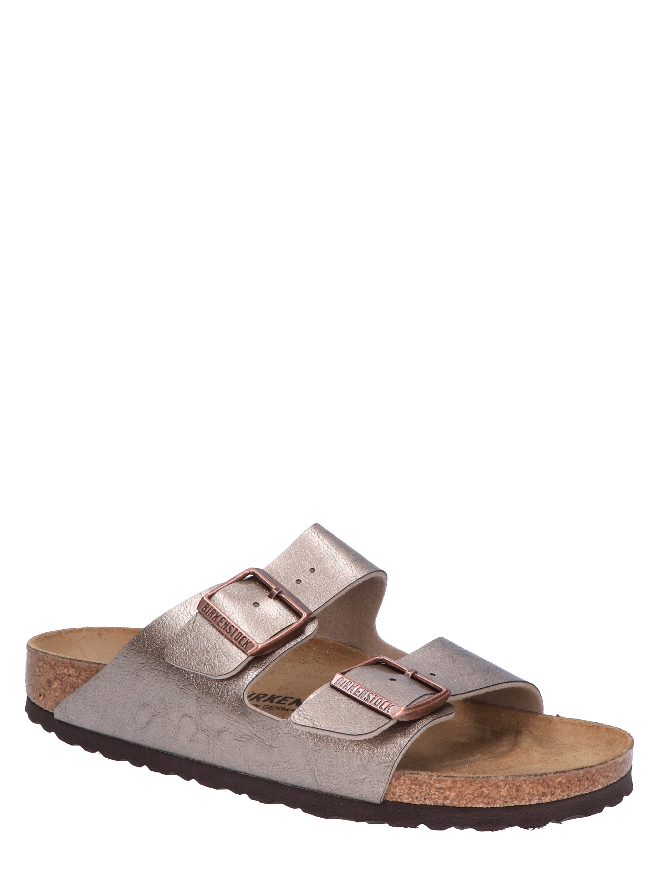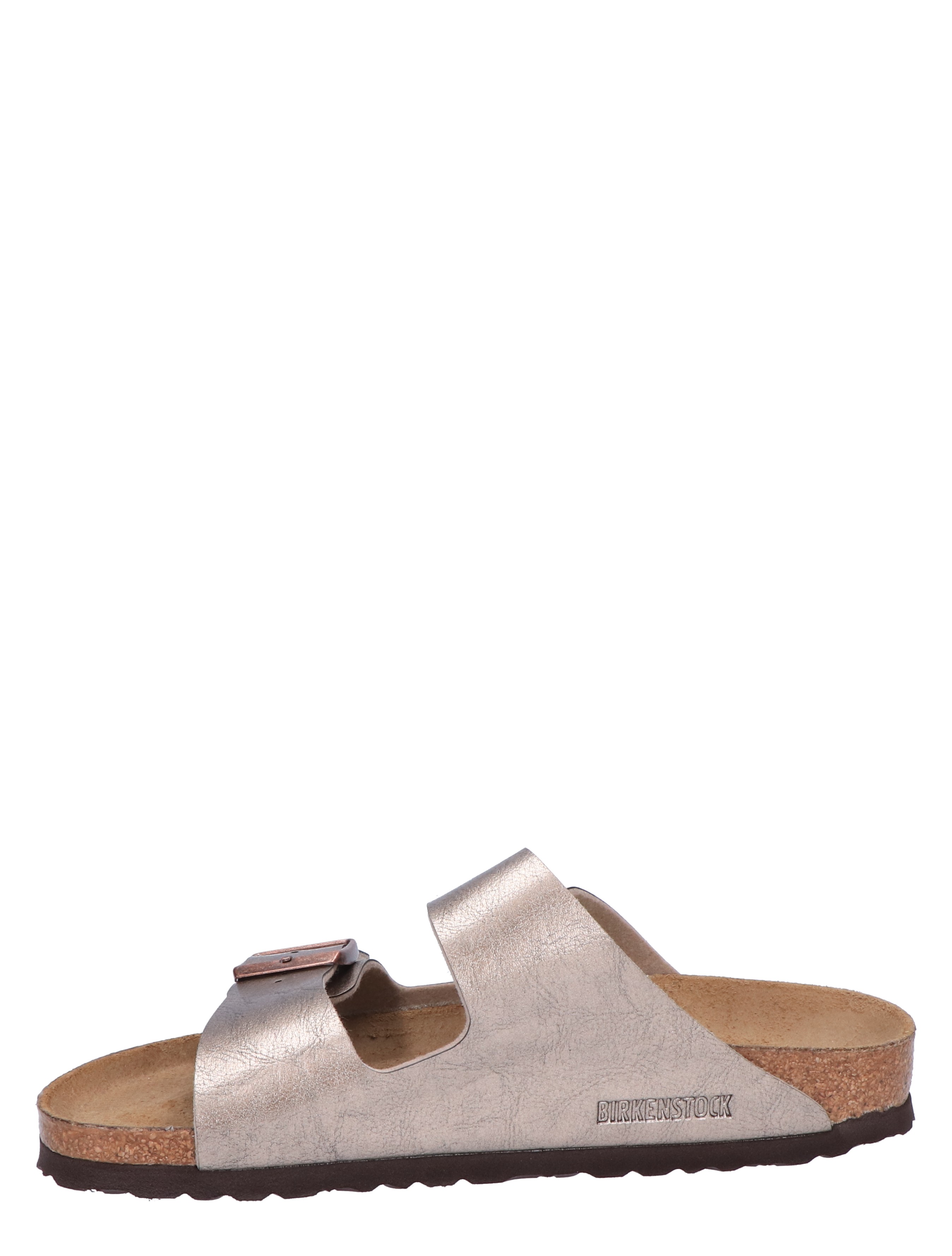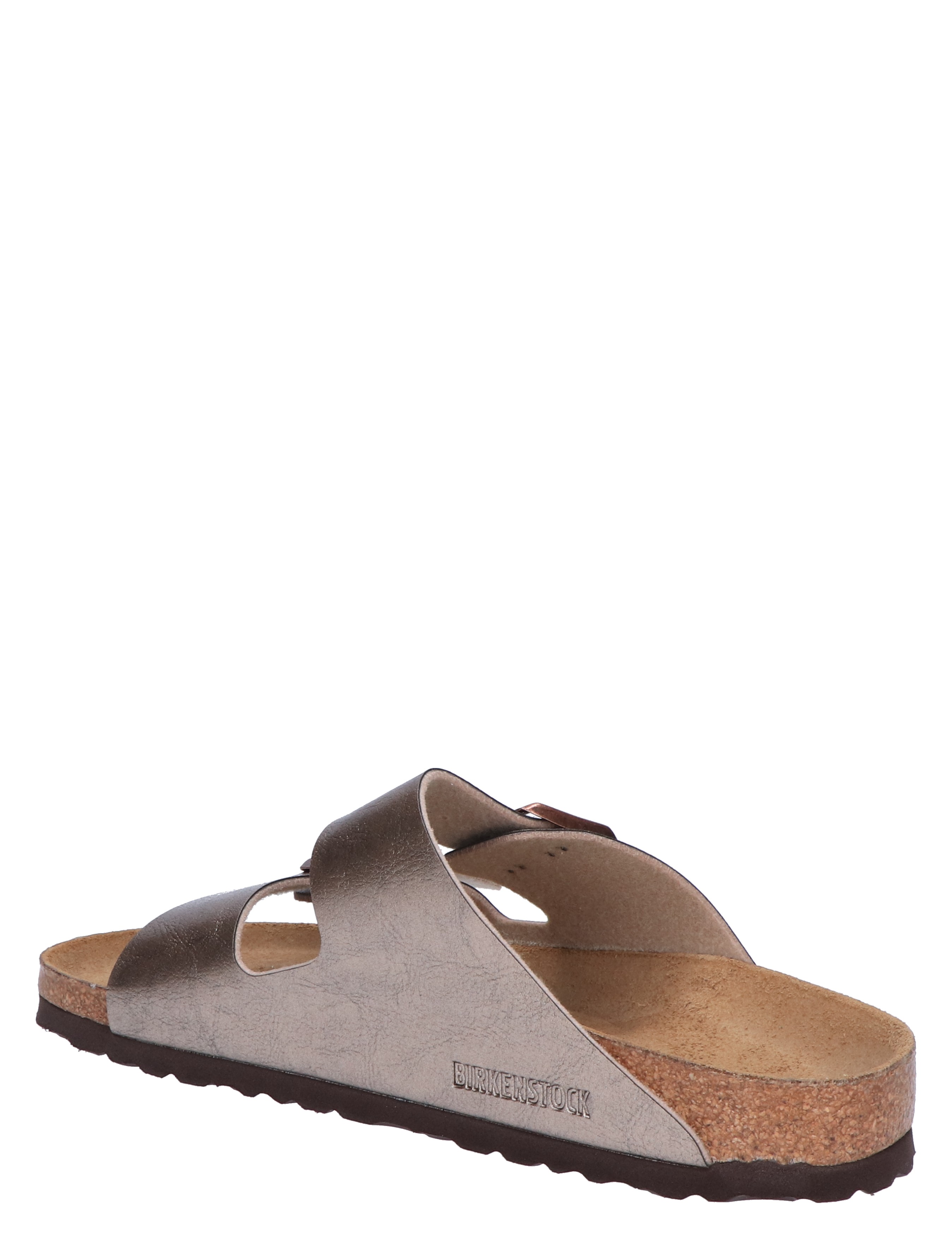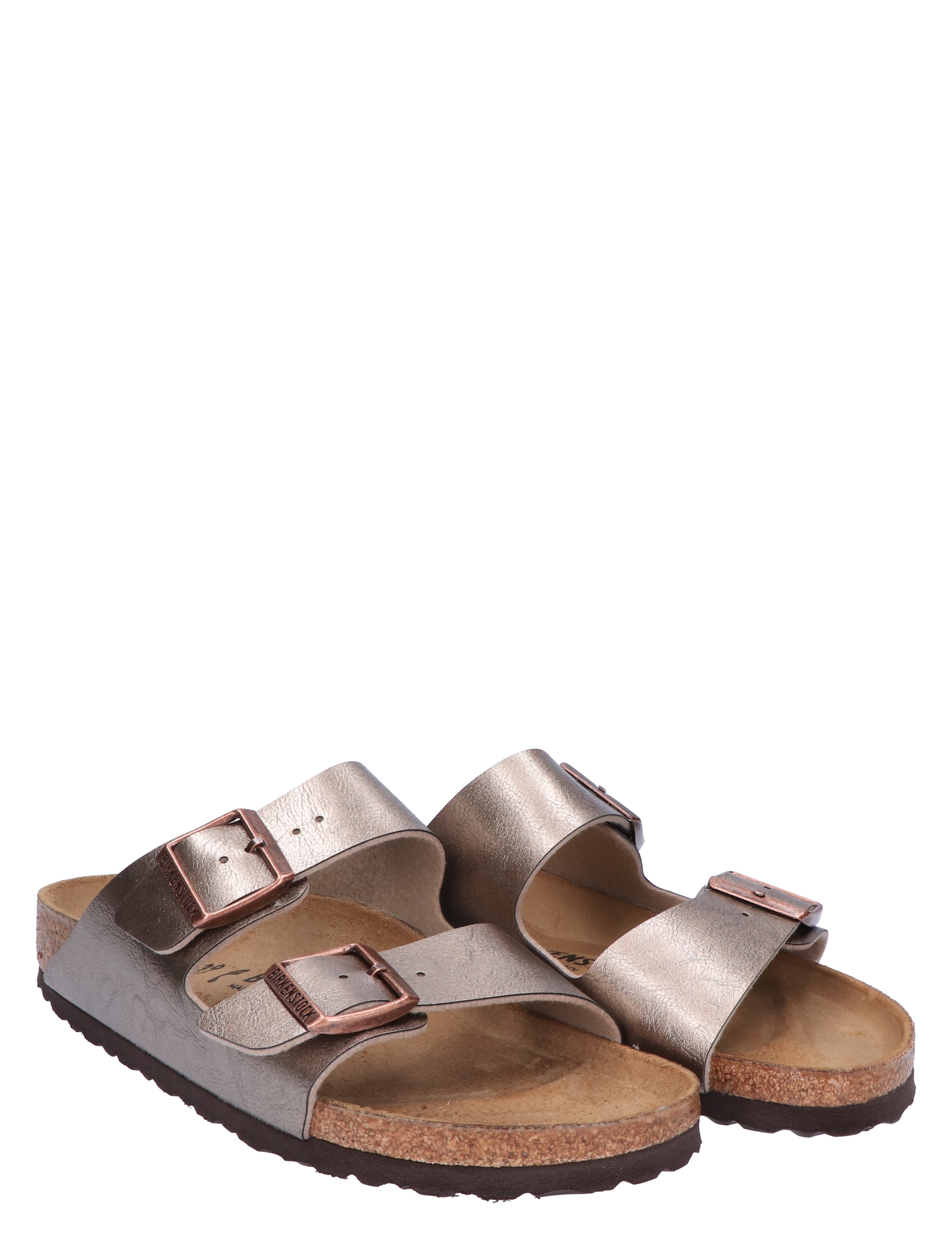 Birkenstock Arizona Metallic Birko-Flor Narrow voor dames in graceful taupe. De Arizona slipper overtuigt door de goede pasvorm en het nonchalante, natuurlijke design. De slipper heeft twee individueel verstelbare metalen gespen. Het bovenmateriaal is van zacht, Birko-Flor en het originale Birkenstock voetbed zorgt voor extra comfort. Made in Germany.