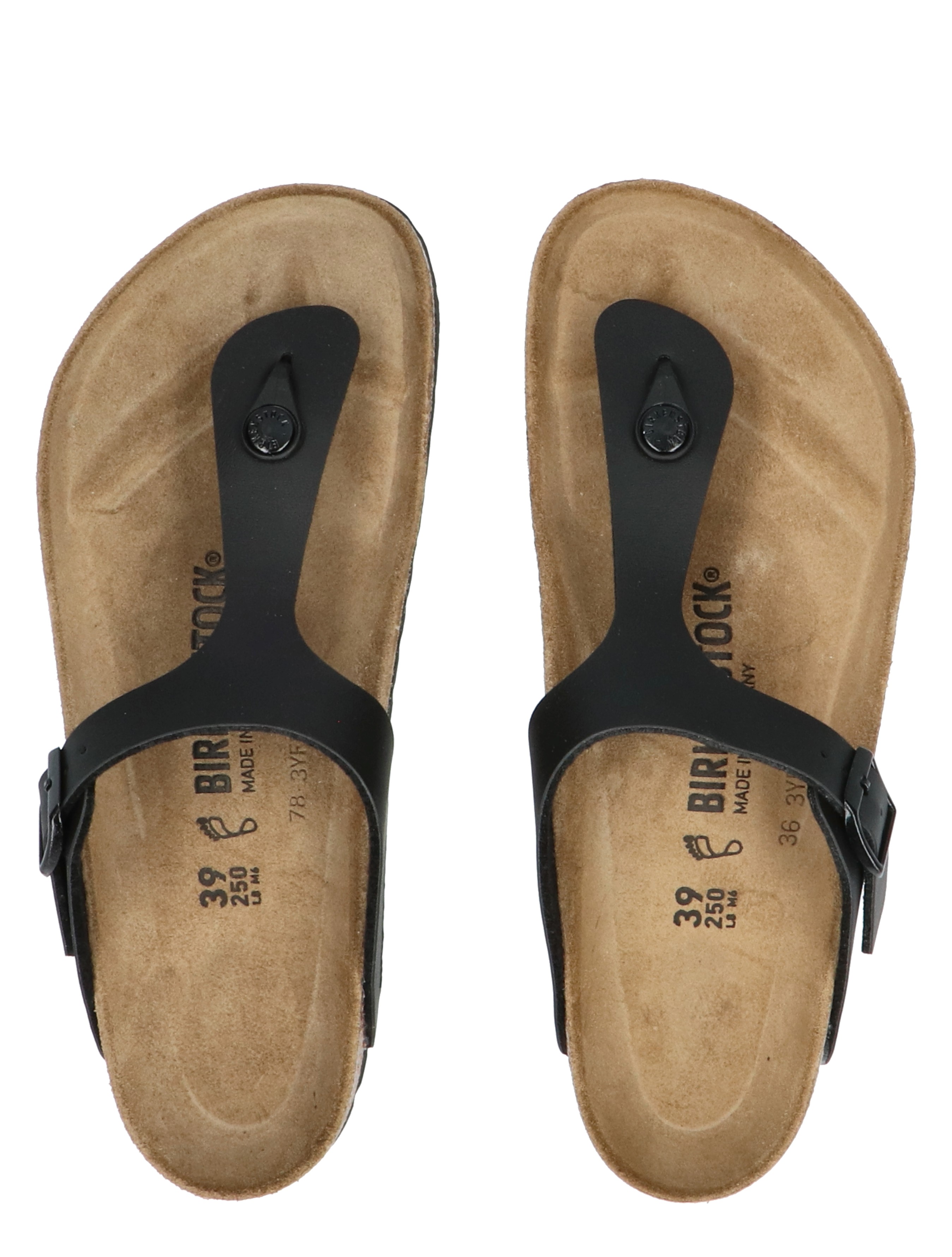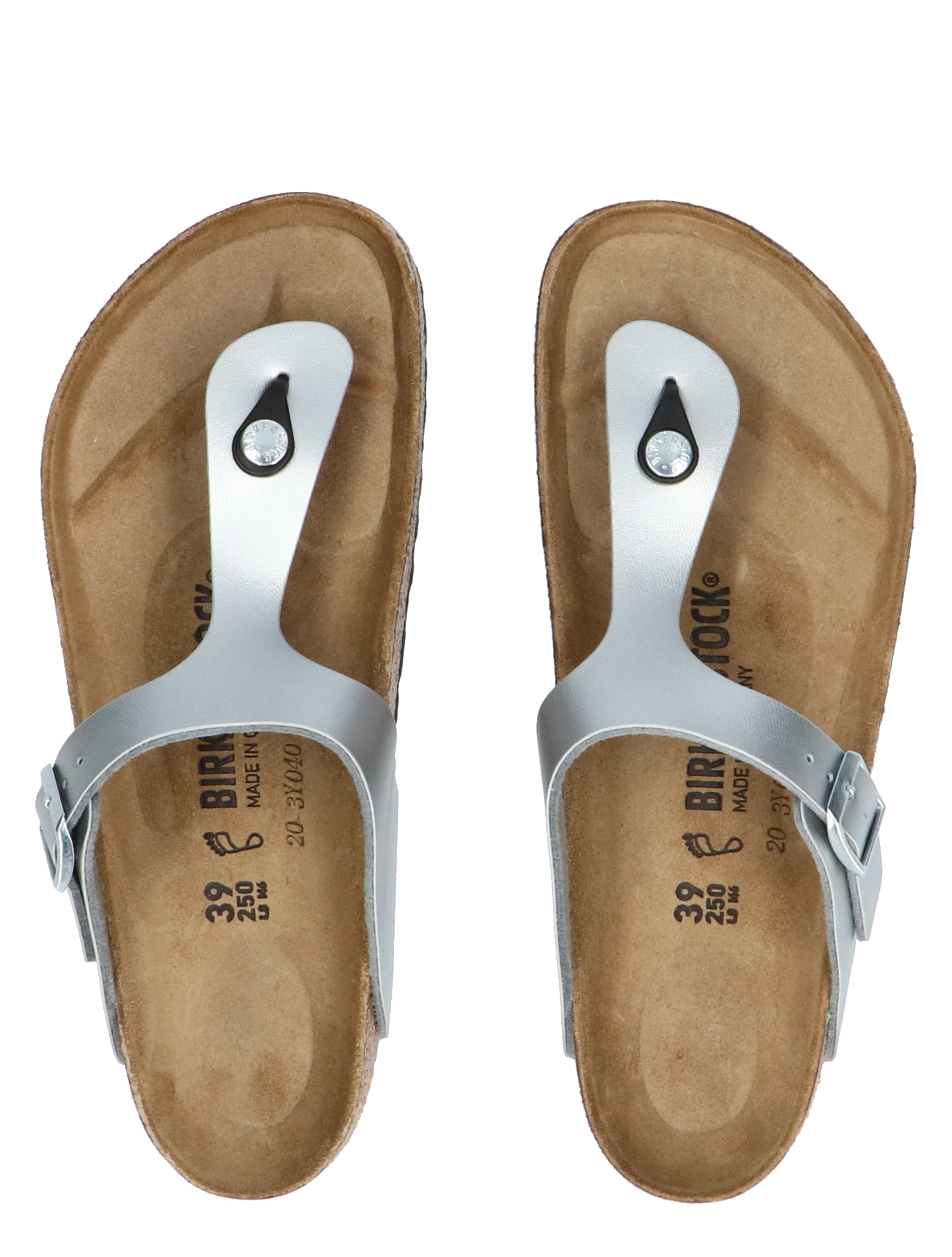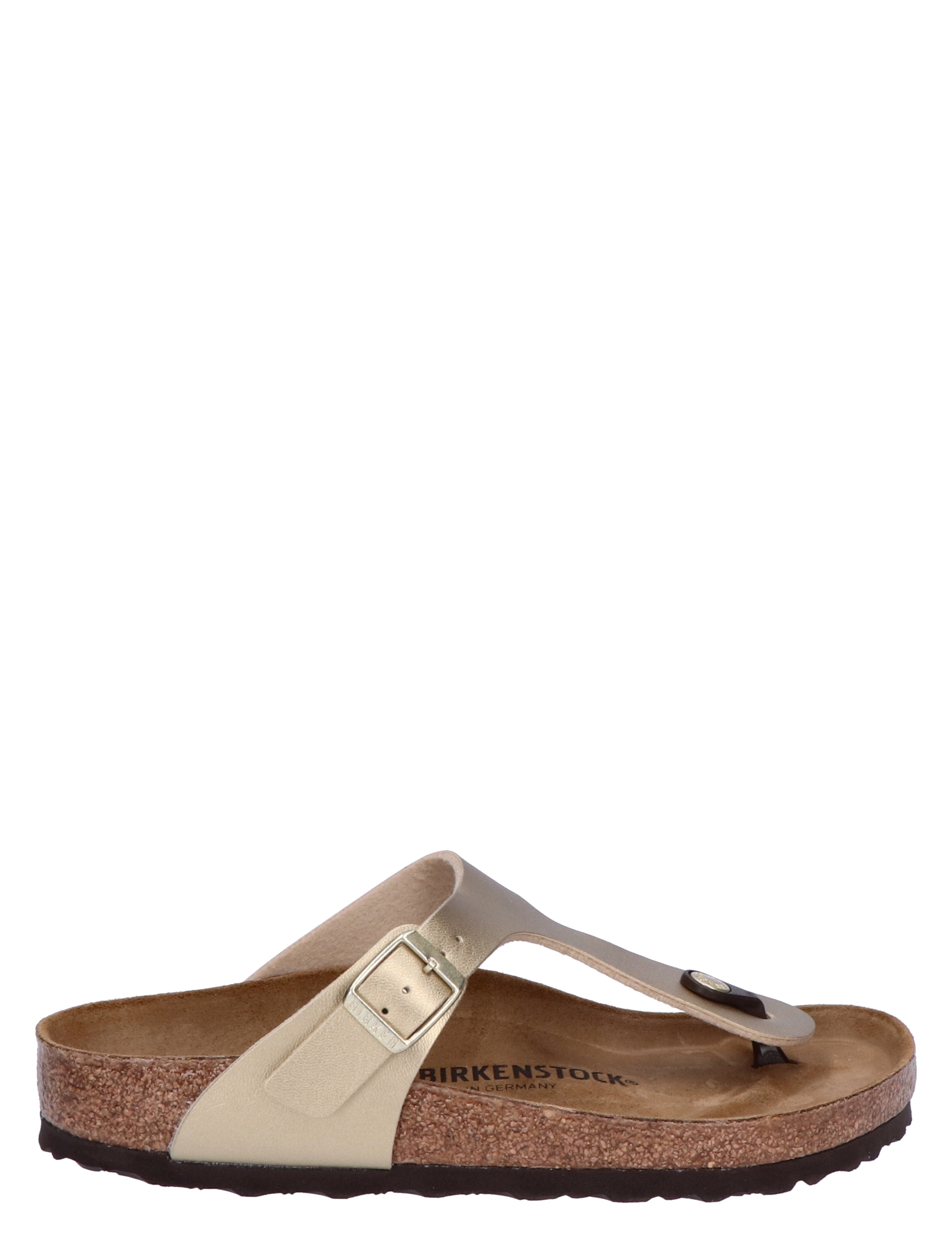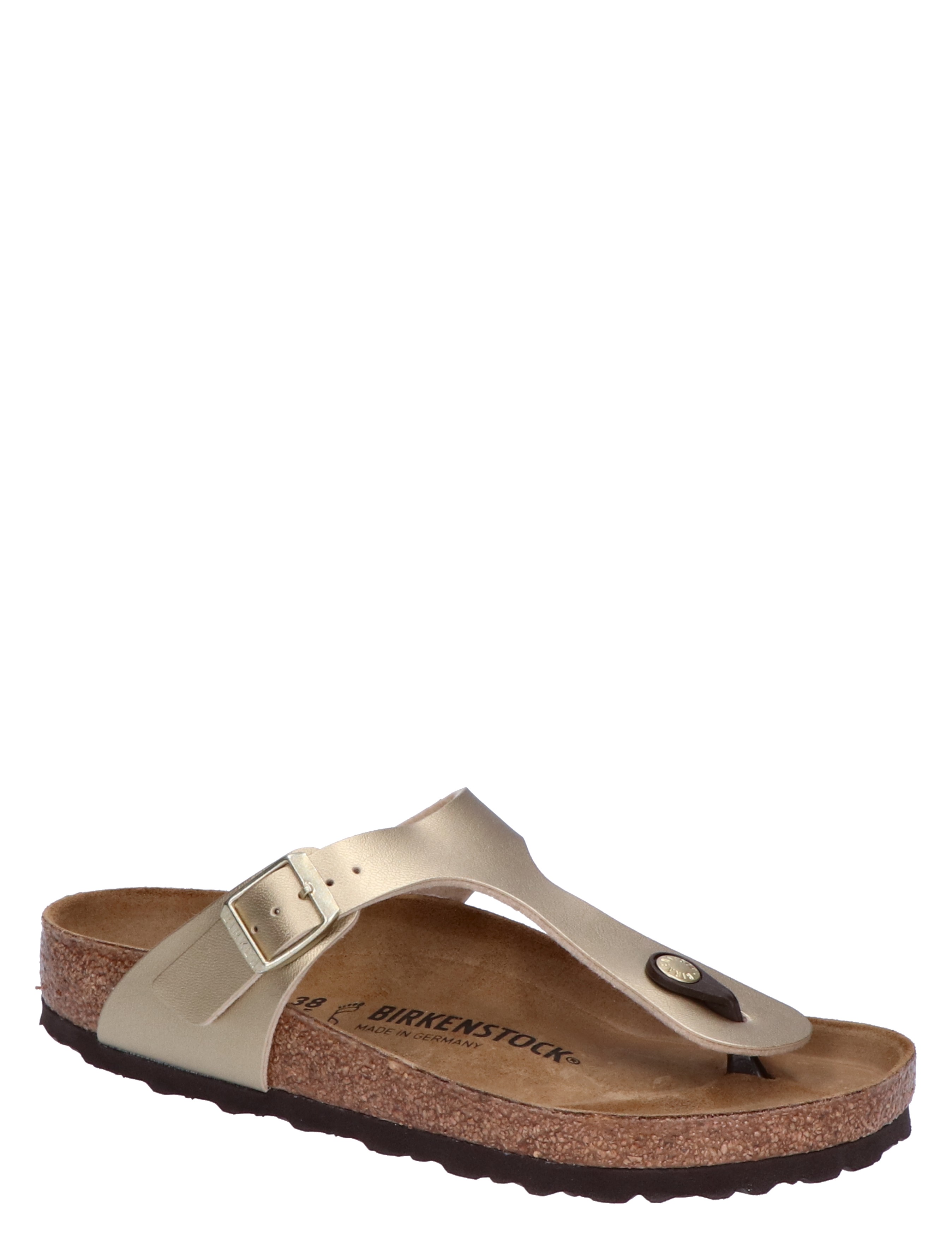 Birkenstock Gizeh Birko-Flor Regular dames in gold. Het model Gizeh is een echte klassieker en een stilistische allrounder. Deze elegante teensandaal combineert optimaal houvast met een minimalistische, moderne vormgeving. Het bovenwerk bestaat uit het huidvriendelijke en slijtvaste synthetische materiaal Birko-Flor® en het originale Birkenstock voetbed zorgt voor extra comfort. De Gizeh sluit met een metalen gesp. Made in Germany.