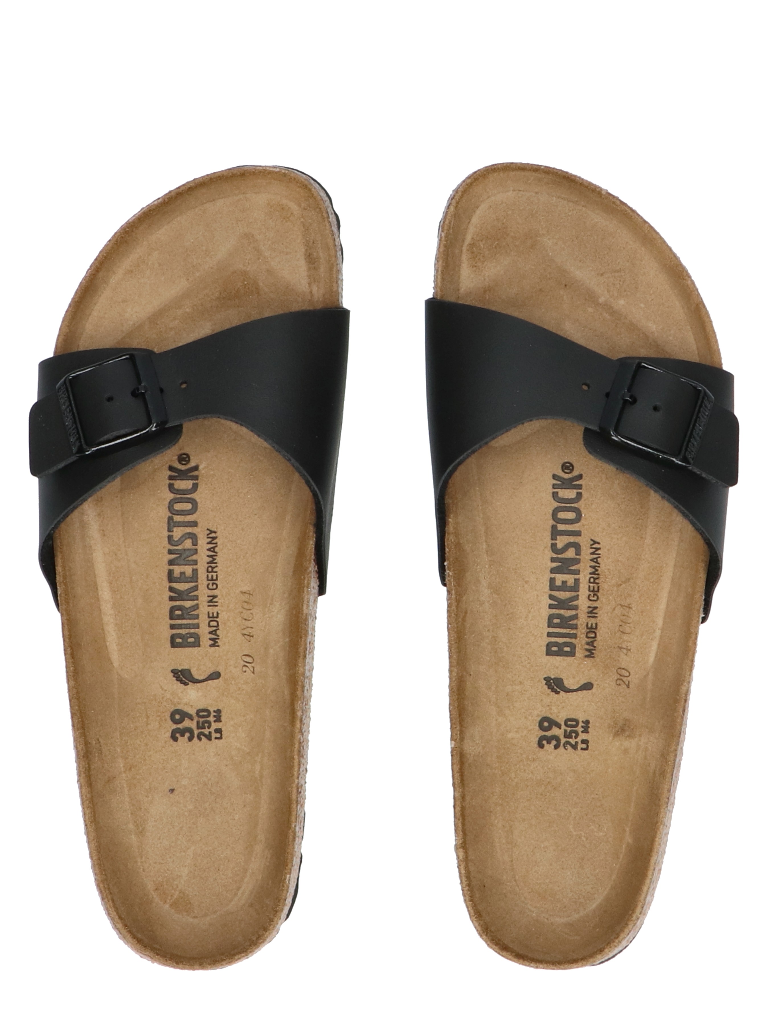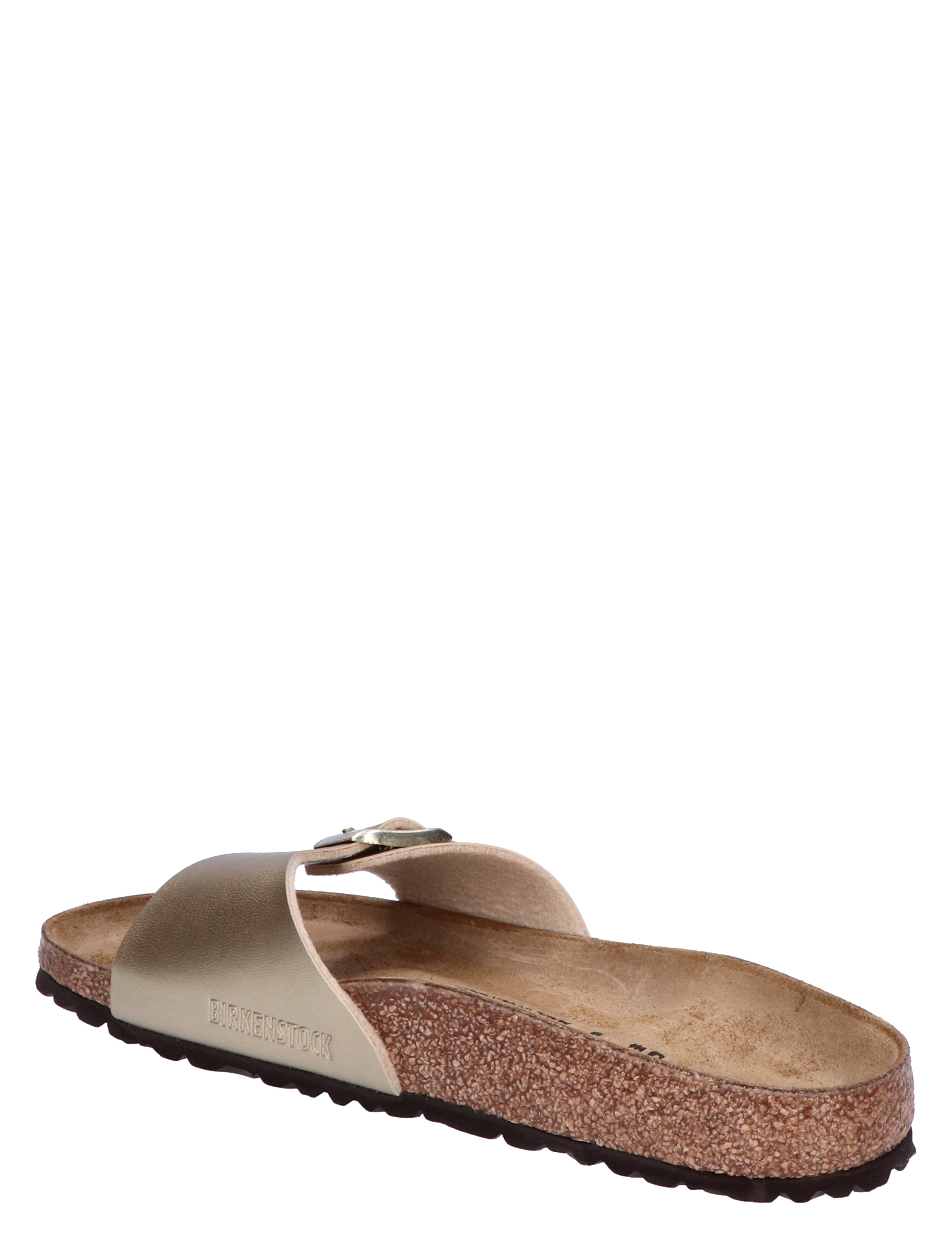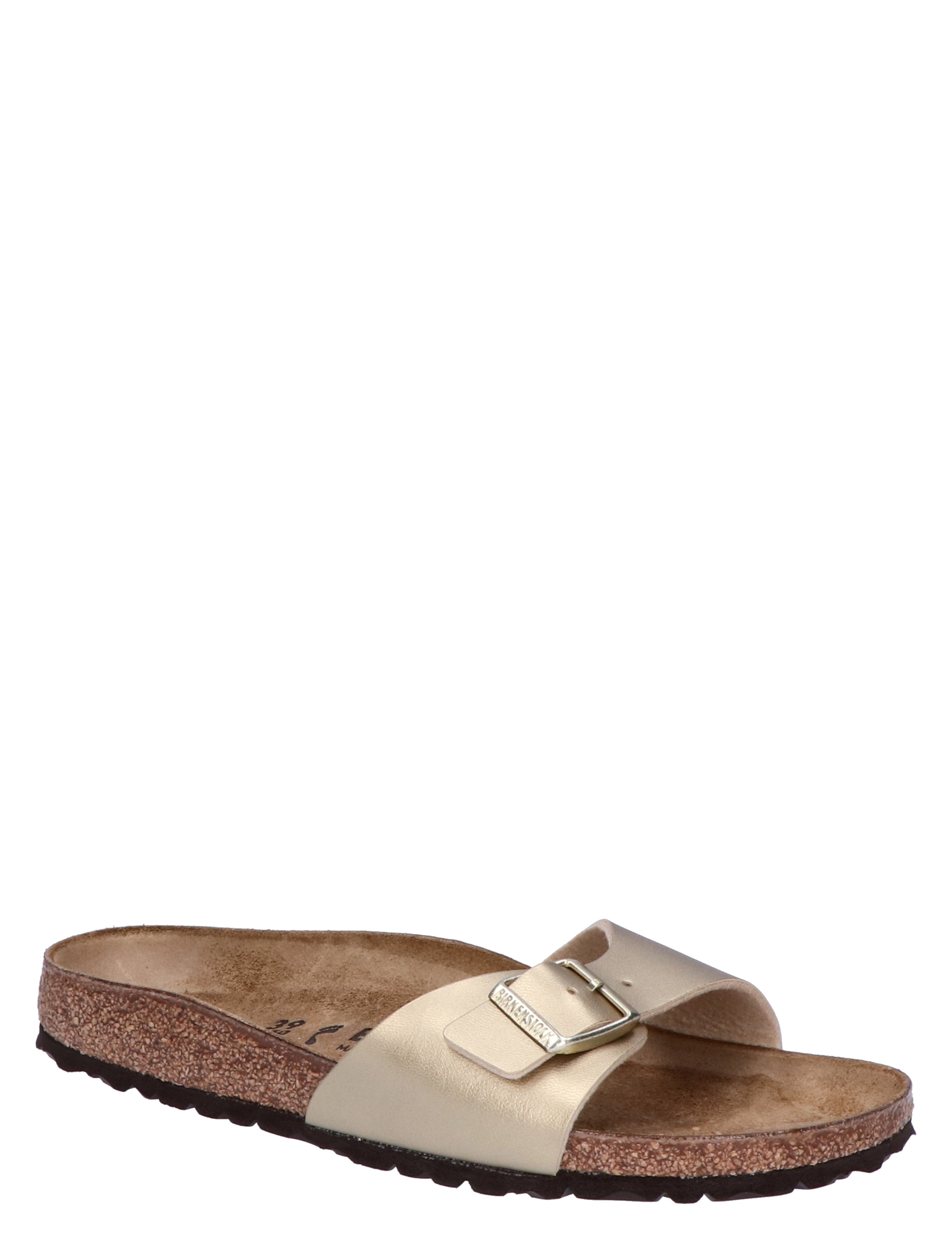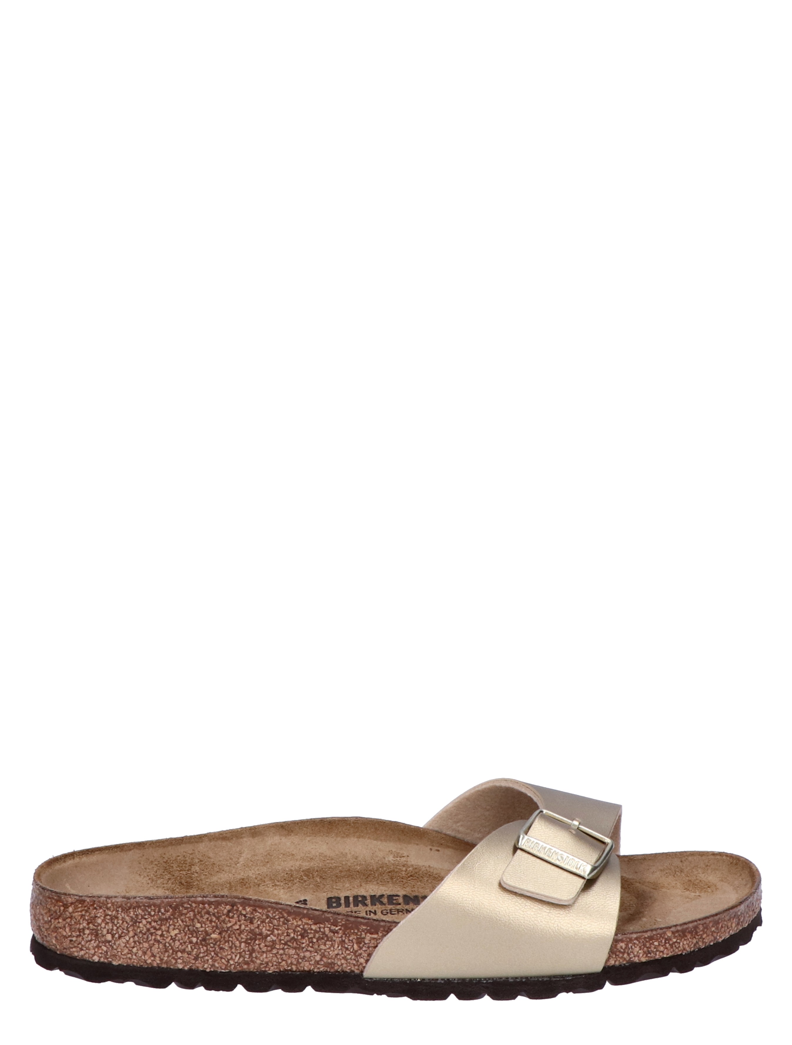 Birkenstock Madrid Birko-Flor Narrow dames in gold. De Madrid is het oudste lid van de modelfamilie van Birkenstock en dus een echte klassieker. Sinds de slipper een halve eeuw geleden als ‘gymnastiekslipper’ werd gelanceerd, is de puristische slipper met één band uitgegroeid tot een modieuze accessoire. Het bovenmateriaal bestaat uit het huidvriendelijke en slijtvaste synthetische materiaal Birko-Flor®.en het originale Birkenstock voetbed zorgt voor extra comfort. De Madrid sluit met een mtalen gesp. Made in Germany.