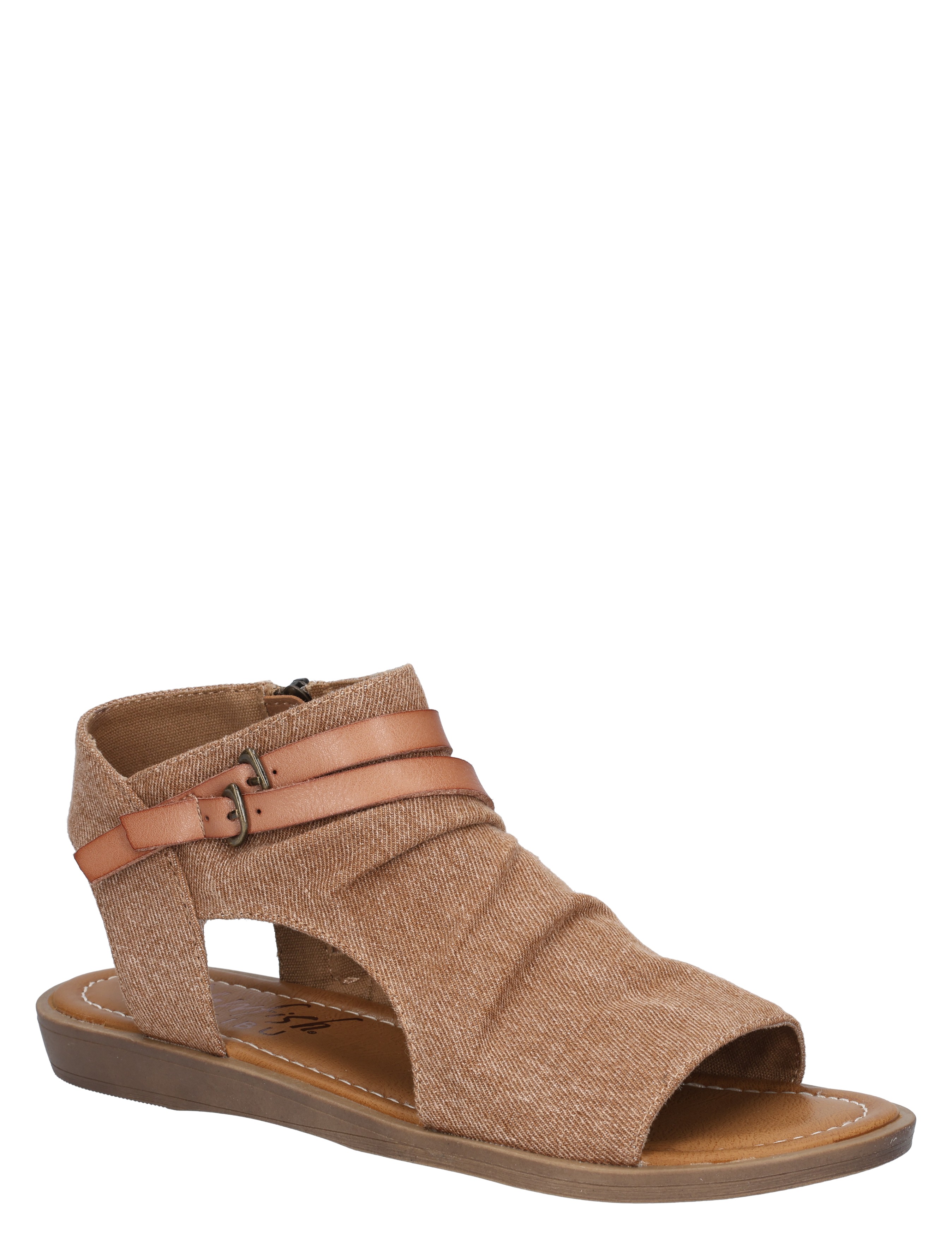 Blowfish Denver J4353 sandaal voor dames in de kleur sand. Deze modieuze sandaal van Blowfish Malibu heeft een hoogfront buitenwerk van denim stof met twee imitatieleren bandjes aan de bovenzijde. De sandaal sluit middels een rits en heeft een padded voetbed van PU. De sandaal is vegan en is volledig vrij van dierlijke producten of bijproducten, waaronder de zool en lijm.