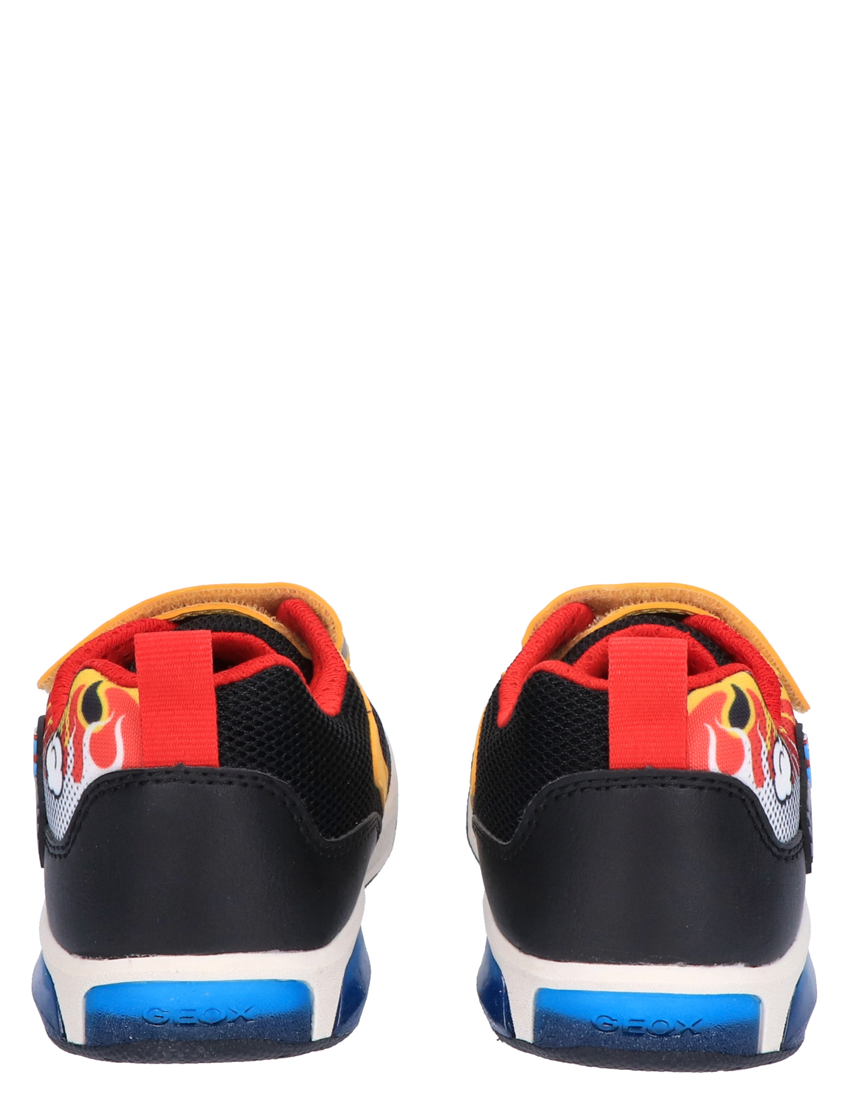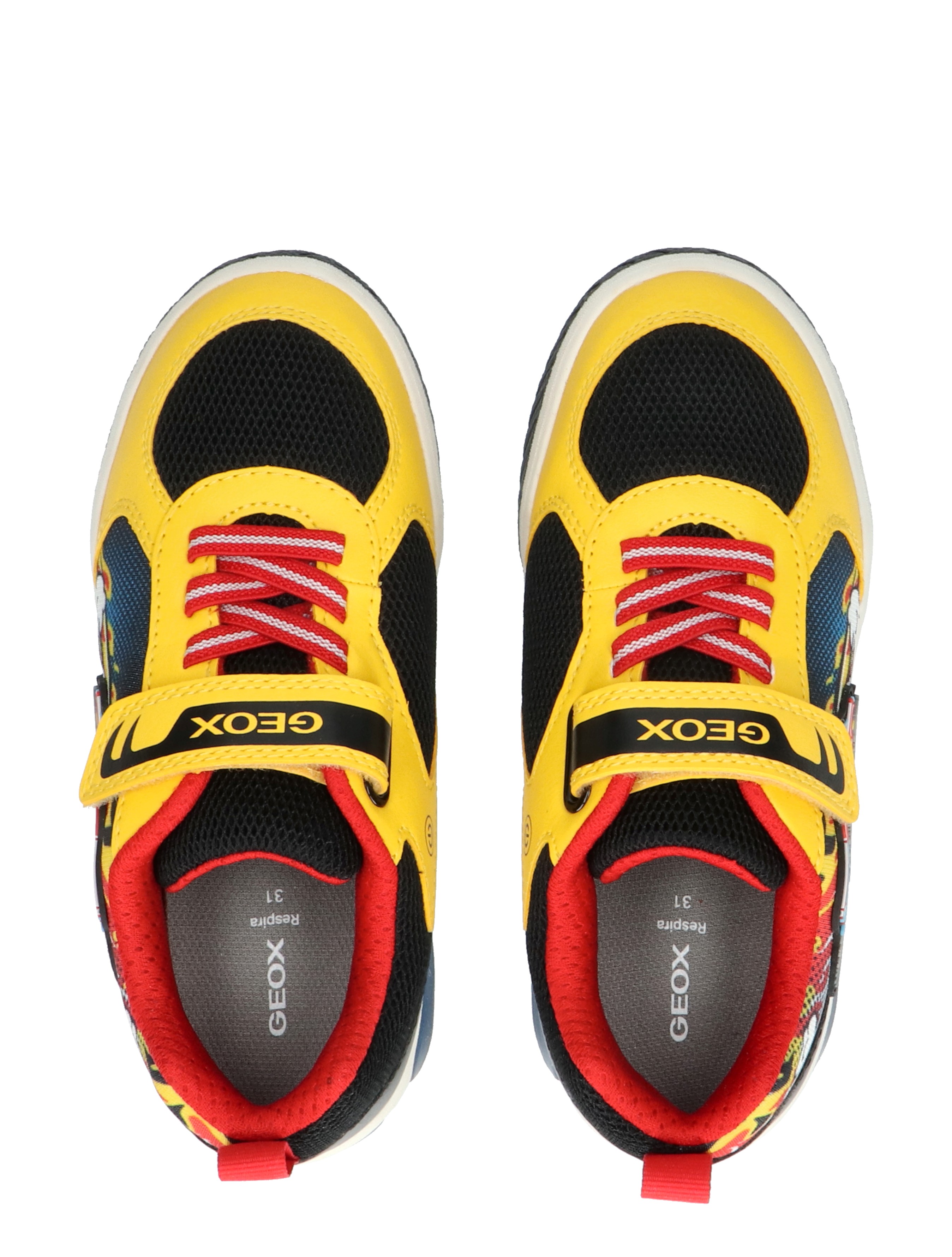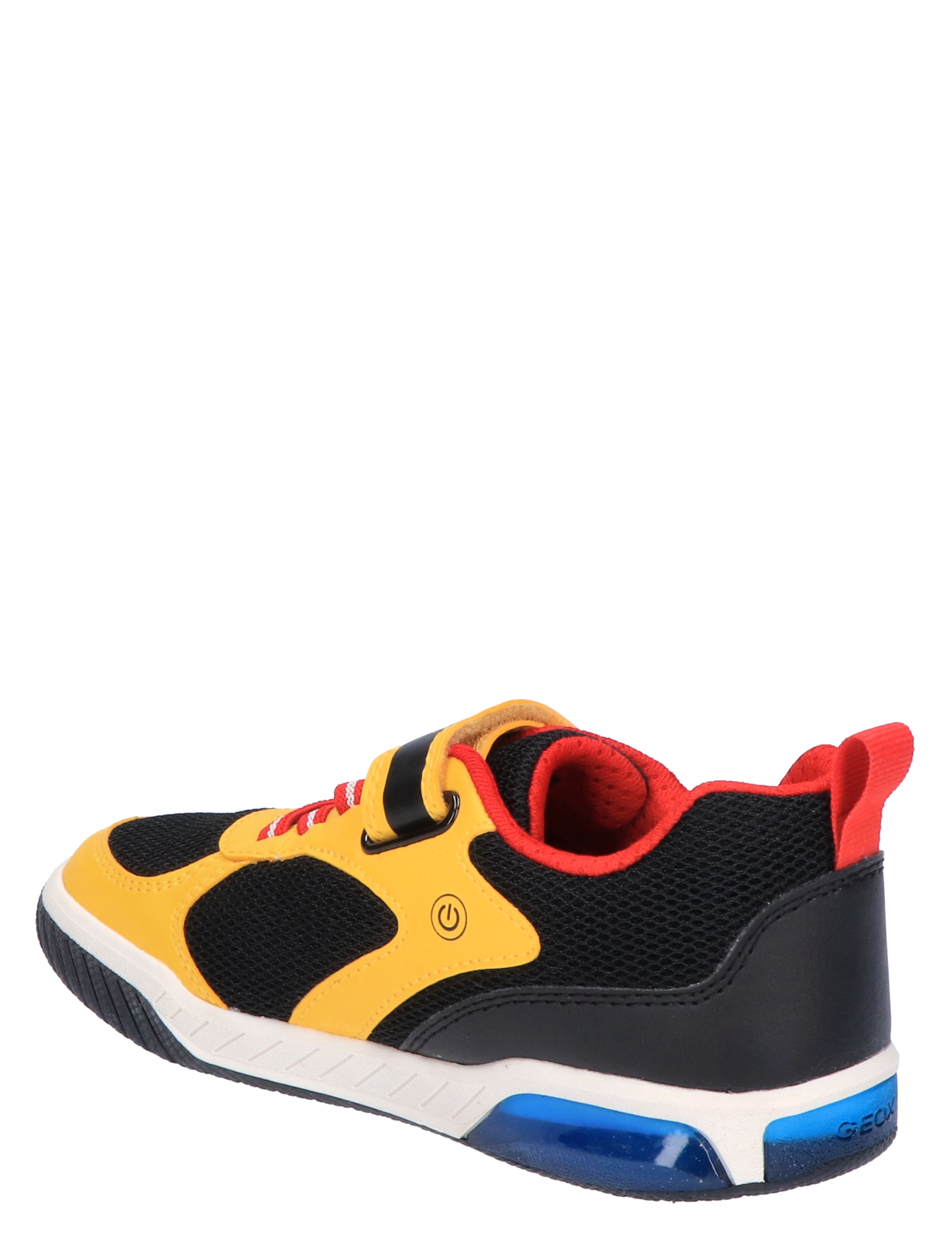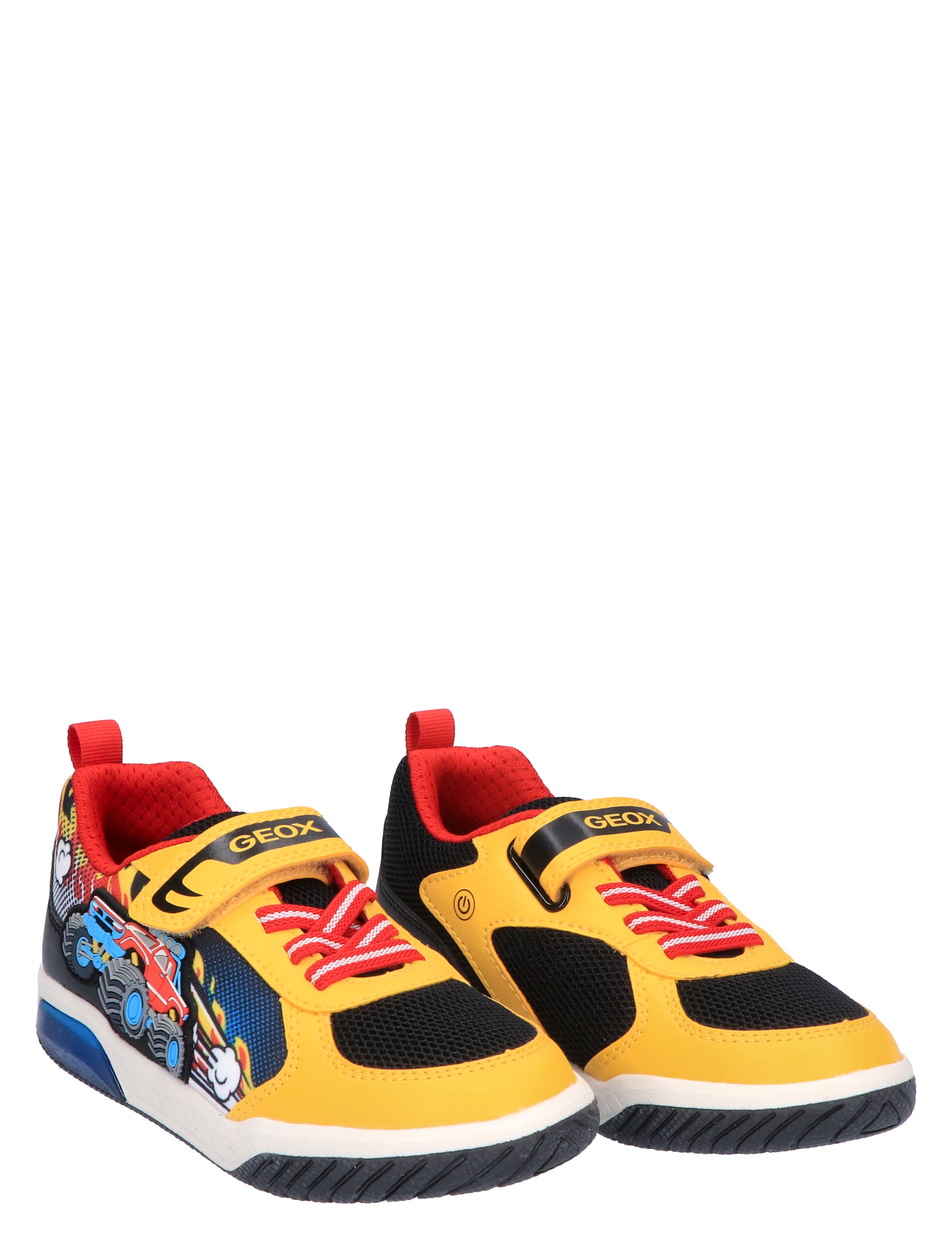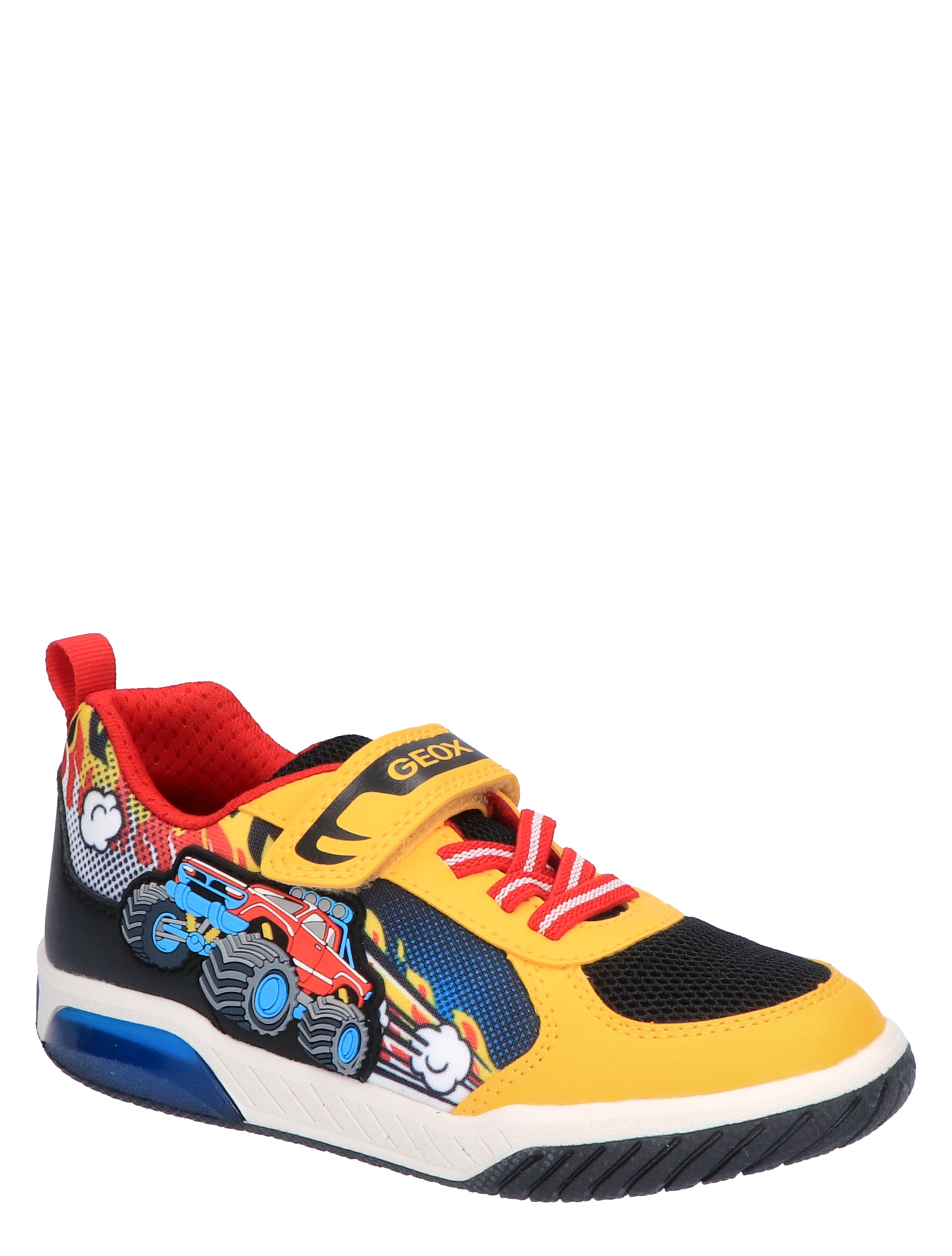 Geox Inek Boy Truck sneaker. De Geox J559CE low-cut sneaker heeft een stoere monstertruck aan de zijkant en is uitgevoerd in yellow red. Gemaakt van geprint mesh en PU. De sneaker is voorzien van lampjes in de buitenzool met een aan/uit schakelaar. Op de lampjes wordt geen garantie verleend. De zool heeft een uitstekend dempend en ademend effect dat bescherming biedt en schokken en trillingen absorbeert.