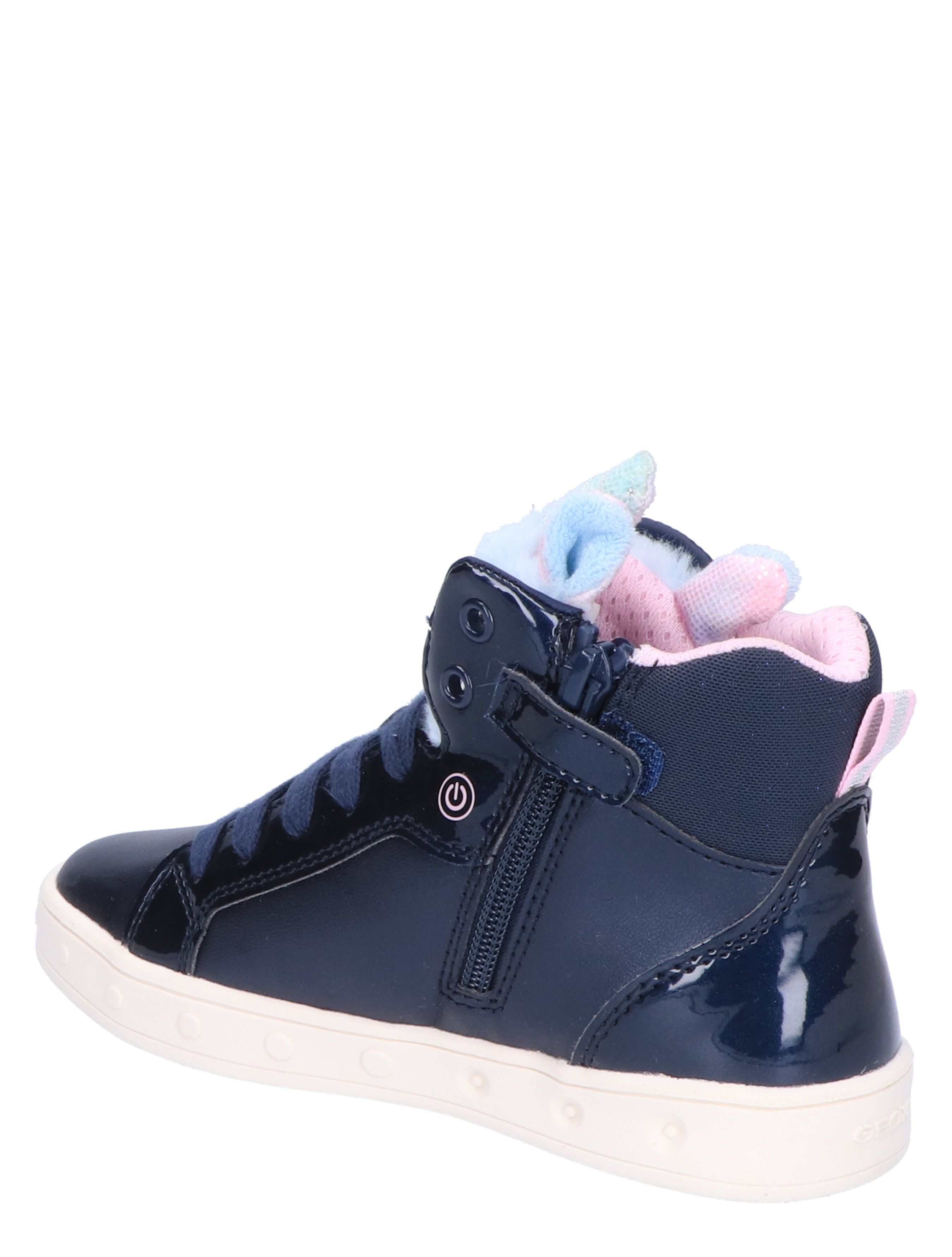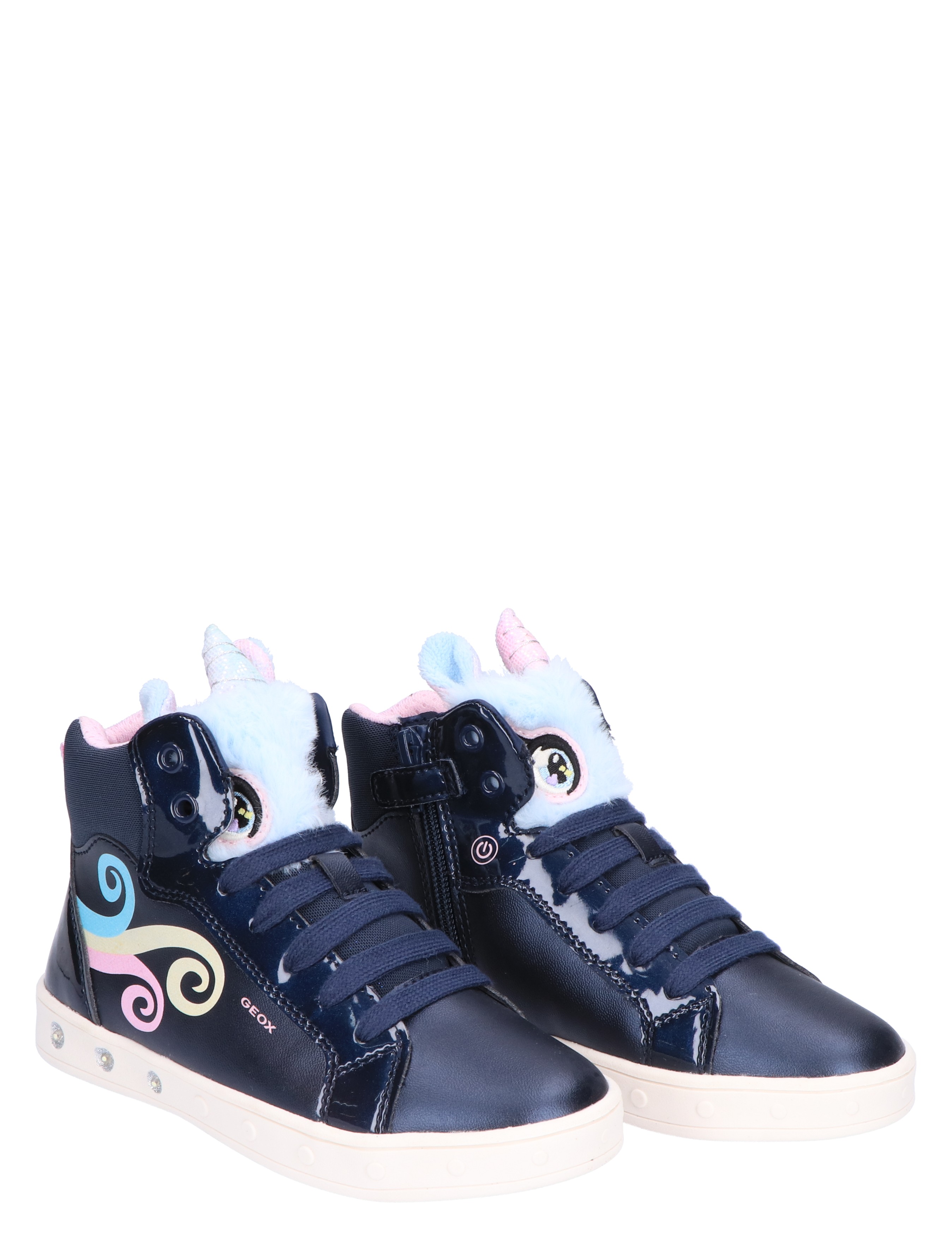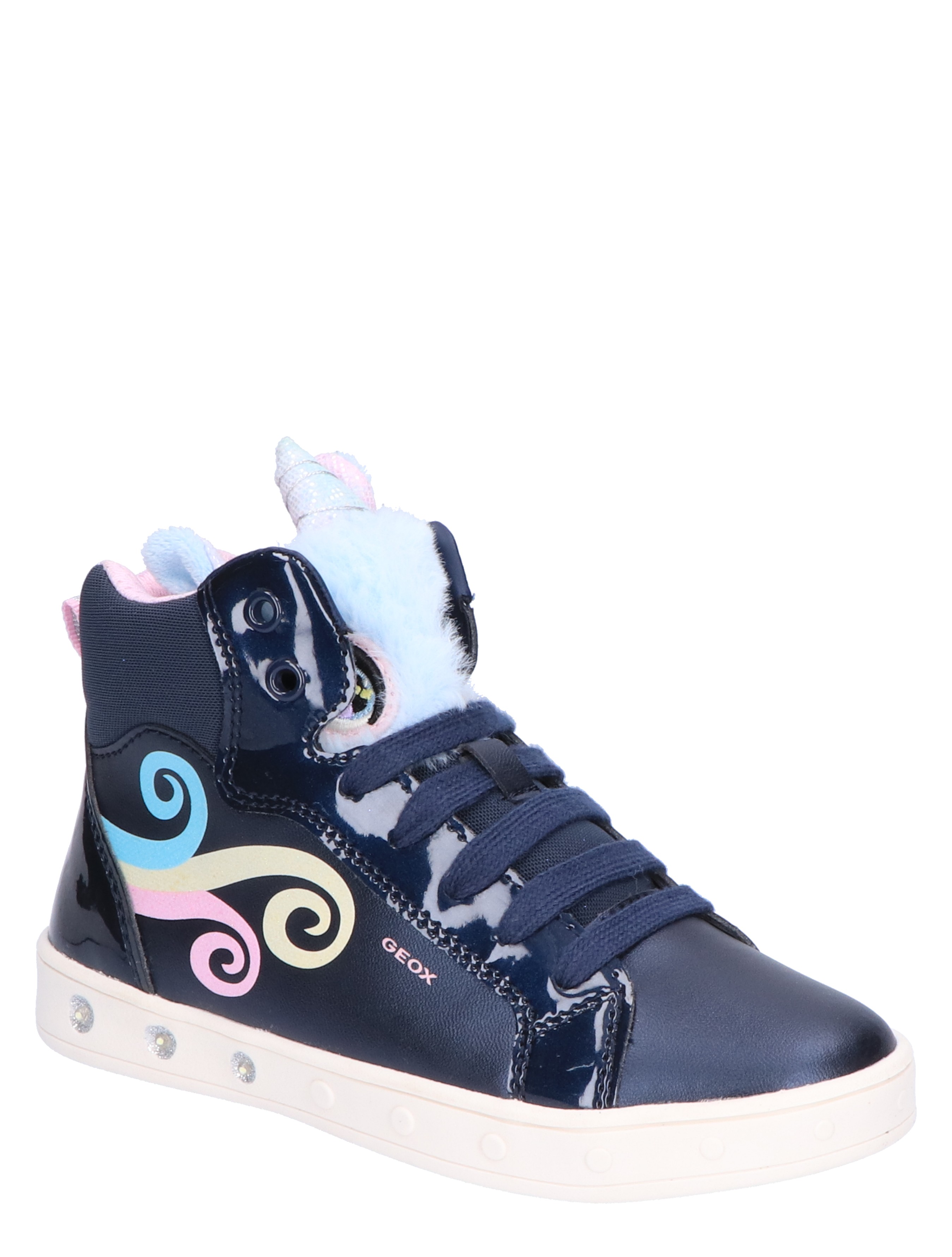 Geox J468WA hoge sneaker voor meisjes. Toffe sneaker gemaakt van PU. Als eye catcher heeft de sneaker een fluffy unicorn op de tong. De lampjes in de zool kan je zelf aan en uit zetten. Voorzien van een zijrits voor een makkelijke instap. Op de lampjes zit geen garantie.