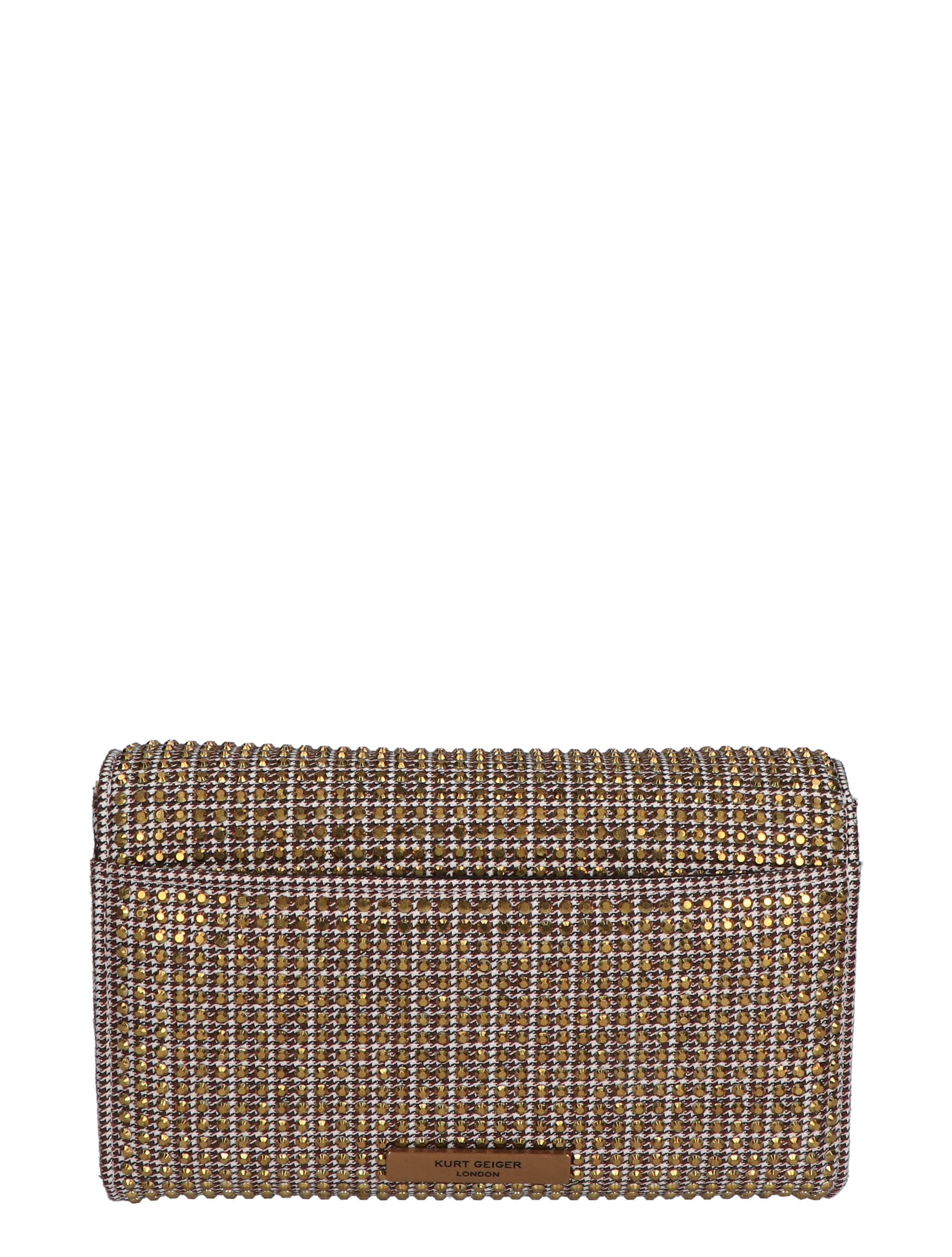 Kurt Geiger Kensington Chain Wallet tas voor dames in beige. Deze glamorous clutch van Kurt Geiger tilt je party look naar een hoger niveau. Het model heeft een pied-de-poule print versierd met kleine bronskleurige strass steentjes. De overflap is versierd met de kenmerkende Kurt Geiger adelaarskop en sluit middels twee drukknopen. De binnenzijde bestaat uit twee compartimenten en een klein middenvak met rits. Draag de tas over de schouder met de smalle schouderketting of zonder ketting als clutch in de hand.