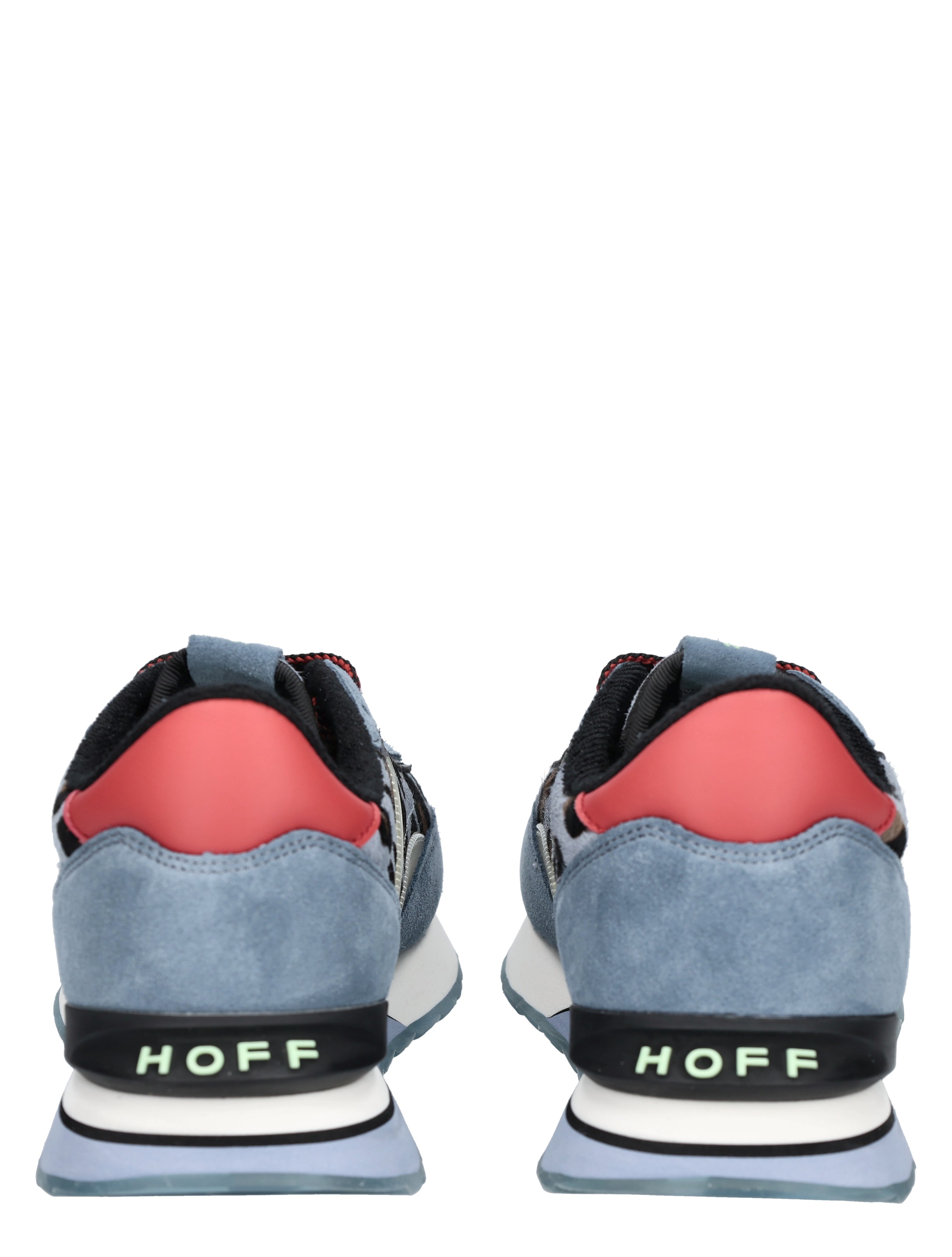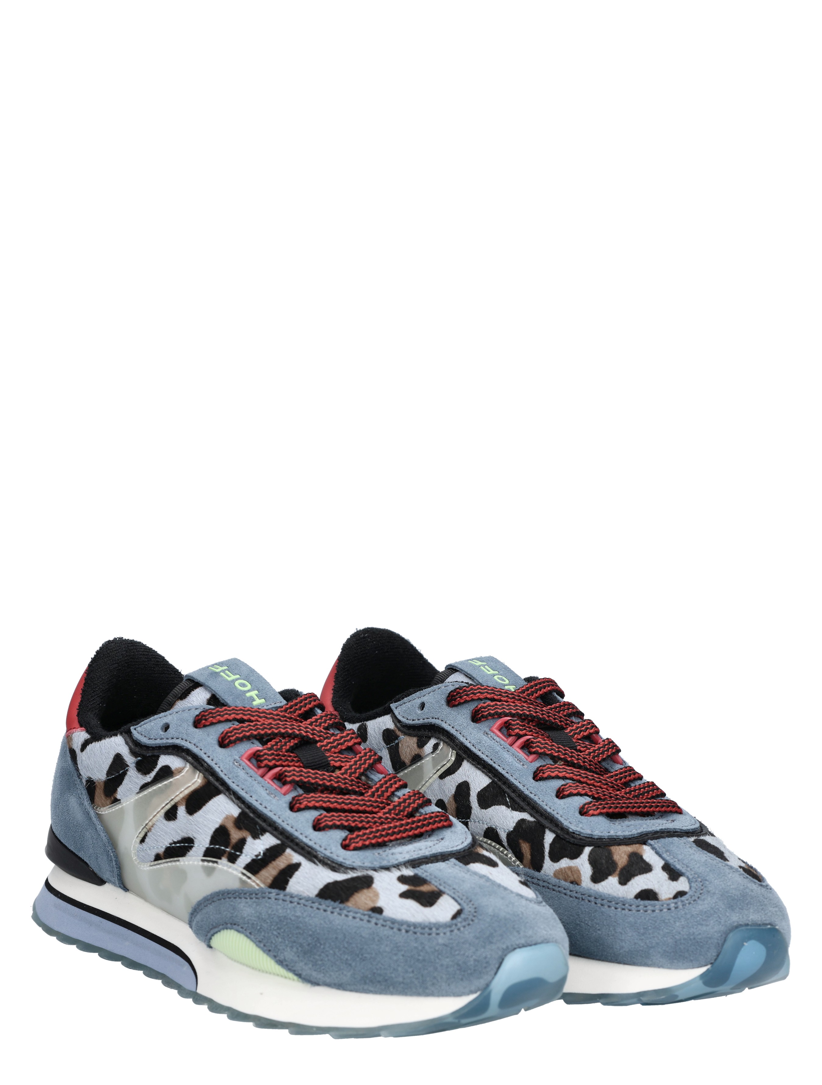 The Hoff Brand Art sneaker in blue voor dames. Deze sneaker heeft een combinatie van materialen en kleuren met inzetstukken van ponyhair met een kleurrijke leopard print, suede details en (transparante) kunststof elementen. Het hielstuk is van PU. De gekleurde zool heeft een logodetail op de hiel en transparante buitenzool met een bijpassende leopard print. De buitenzool is van 80% EVA, 20% TPR.