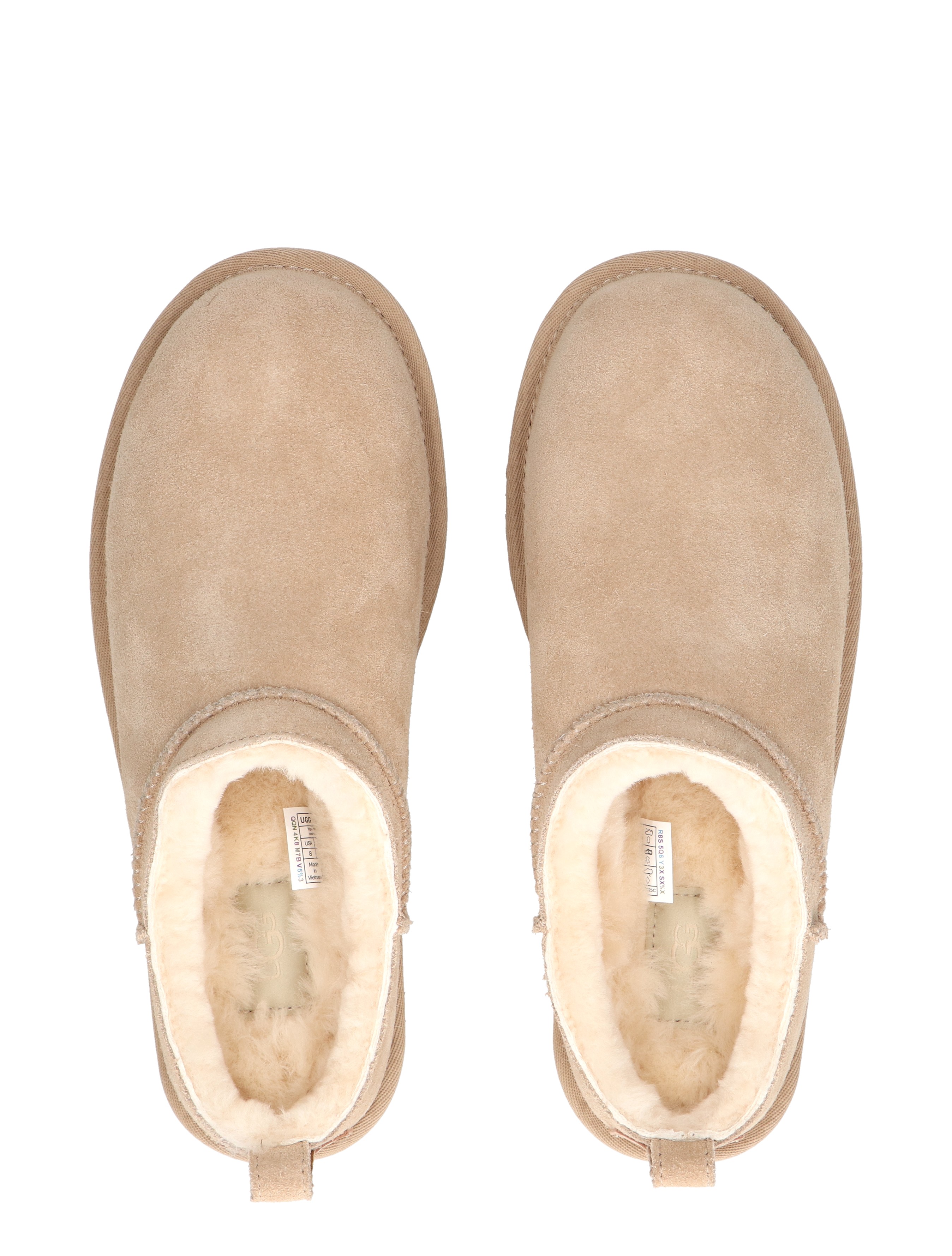 UGG Classic Micro enkellaars voor dames in de kleur sand. De UGG Classic Micro is een nieuwe versie van de Classic boot met een nieuw laag profiel en hoogstaand comfort. Het model heeft een bovenwerk van echt suède, gevoerd met superzacht schapenvacht dat op natuurlijke wijze de temperatuur reguleert, zodat je sokken kunt dragen – of niet. De lichtgewicht EVA-buitenzool van suikerriet biedt moeiteloze ondersteuning en voegt dat comfortabele pantoffelgevoel toe aan elke buitenactiviteit.